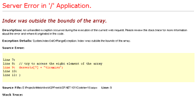 In order to see what an exception looks like, consider the following simple ASP.NET script, which contains a deliberate error - trying to access an element of an array which does not exist.
