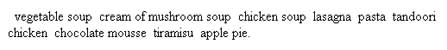 string [] meals = {"vegetable soup", "cream of mushroom soup", "chicken soup", "lasagna", "pasta", "tandoori chicken", "chocolate mousse", "tiramisu", "apple pie" };