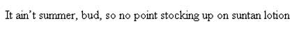output.Text = "It ain't summer, bud, so no point stocking up on suntan lotion";