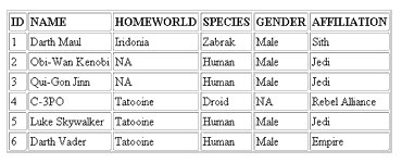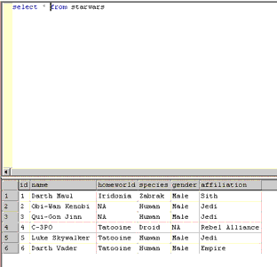 Next, we need some data to play with. For the following examples, I shall be using a Microsoft SQL Server 2000 database called “pubs” and a table named “starwars” containing a list of characters that play vital roles in the epic Star Wars series. Here’s the SQL code to create the table (you can use the Query Analyzer tool included with SQL Server 2000 to execute them):