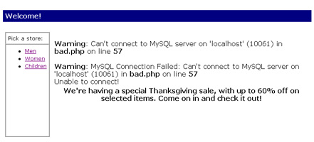 Now, consider what happens if an error occurs during execution of the PHP functions near the middle of the script - say, for example, the database server does down. Here’s what the resulting output might look like: