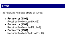 <?php } else { // include class include_once("errorReporter.class.php"); // initialize error reporter $e = new errorReporter(); // perform form validation on data entered by user if (empty($_POST['name'])) { $e->raiseError(1101, "NAME"); } if (empty($_POST['filling'])) { $e->raiseError(1101, "FILLING"); } if (empty($_POST['flavour'])) { $e->raiseError(1101, "FLAVOUR"); } // check to see if any errors // display if so if ($e->numErrors() > 0) { $e->displayNonFatalErrors(); } // if we get this far, it means // there were no errors in the form data // now let's insert this data into a database $name = $_POST['name']; $filling = $_POST['filling']; $flavour = $_POST['flavour']; $connection = mysql_connect("localhost", "user", "pass") or $e->raiseError(102, "LOCALHOST"); mysql_select_db("users") or $e->raiseError(104, "USERS"); $query = "INSERT INTO profile (name, filling, flavour) VALUES ('$name', '$filling', '$flavour')"; $result = mysql_query($query) or $e->raiseError(101, $query . mysql_error()); // all done? // display success code echo "Success!"; } ?>