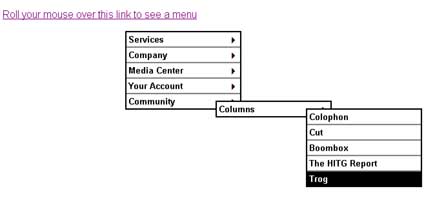 <a href="#" onMouseOver="popUp('HM_Menu1',event)" onMouseOut="popDown('HM_Menu1')">Roll your mouse over this link to see a menu</a>