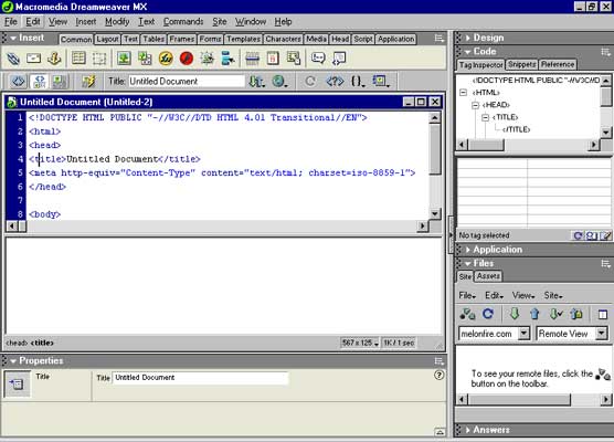 Dreamweaver MX’s interface can be quite daunting to developers used to working in plain-vanilla text editors for PHP development. Here’s a quick screen shot of the Dreamweaver work area: