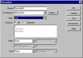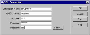 This box allows you to specify access information for the database server. For this example, create a connection called “dbConnect” and provide Dreamweaver with the username and password required to access the database server, together with the name of the database to be used.