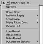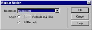 pop open the “Server Behavior” tab of the “Application” panel, and select the “Repeat Region” behavior from the drop-down option list, and tell it to loop for as many times as there are records.