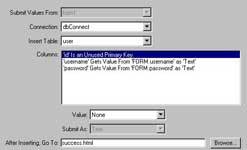 Once the form has been prepared, apply the “Insert Record” server behavior, and you’ll see a dialog box like this: