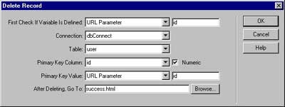 It’s just as simple to delete records - create a new PHP script and use the “Delete Record” server behavior. You’ll see the following dialog box, which asks you to specify the variables that the script should use when identifying which record to delete.