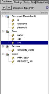 As an example, consider the following example, in which I’ve added three form variables, one session variable and one server variable to the Dreamweaver “Bindings” tab.
