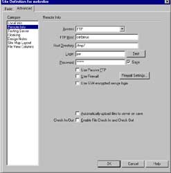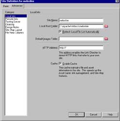 You can also optionally tell Dreamweaver about a “remote site” - this is usually the location where your Web server is running, and where your files will ultimately go for testing and deployment. Dreamweaver allows you to also specify the access mechanism for such a remote site - FTP, LAN, SourceSafe and so on.