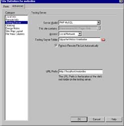 Finally, if you’re developing dynamic pages, you should also specify a “testing server” - this is a folder which can be used by Dreamweaver to process your scripts and dynamically generate documents, either from a database or elsewhere. In an Apache+PHP+MySQL environment, this folder would be the same as the root folder for the application on the Web server. You can also specify a URL prefix, which is used when you try to access the application via a Web browser.
