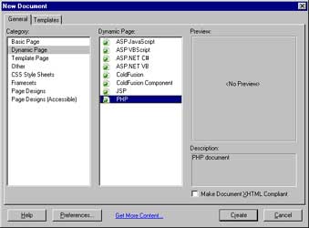 Dreamweaver provides you with an easy way to get started with building a PHP script - pop open the File -> New menu, and select “Dynamic Page” and “PHP” from the pre-defined templates.