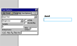 This next example uses the data entered into a Flash form to query a database and return a list of matches. In order to create the form, create a new Button symbol, in much the same way as you created the one on the previous page. Name the form variable within the symbol “q”, and add a copy of the instance to the Flash movie.