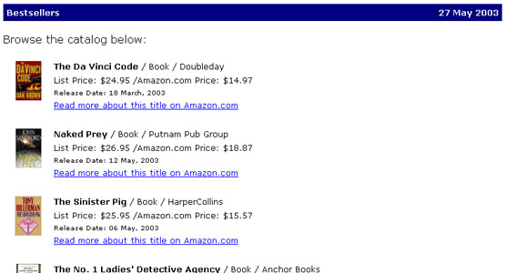 If no data exists, the NuSOAP PHP class is include()-d in the script, a SOAP client is instantiated, and a request is made to Amazon.com to obtain a list of bestsellers (node ID 100 in the AWS system). The response is then parsed and formatted into a Web page suitable for display; it is also simultaneously saved to the cache so that future requests for the same page can be served instantly, without having to query the AWS system each time. The end result: faster responses to user clicks, and an overall enhancement in user perception of your site’s performance.