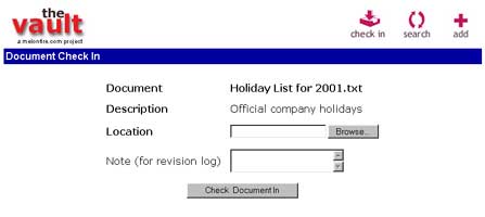 The reverse of the check-in process (the upload of a modified document) is handled by the script “in.php”, available at any time from the main menu at the top of the page.
