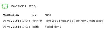 At the same time, the “data” table is updated to reflect that the file is once again available for check-out, and the revision note is inserted into the “log” table, together with the current date and the user’s ID. This data is used to build a revision history of the document - which, coincidentally, is what I’m going to be looking at next.