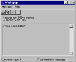 When this message is sent to the Windows workstation named “medusa”, it pops up as a dialog box on that machine (note that in order for this to work, WinPopup must be installed on the target system, and must be configured to accept and display messages).