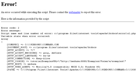 Note also that the script above is silent on the topic of fatal errors. If a fatal error occurs, it will still be displayed to the user, together with any other information PHP chooses to append to the error string.
