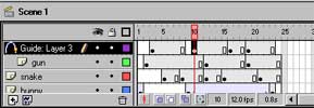 When you first start Flash up, the Timeline typically appears above the main work area (you can alter its position if you like, though why you would want to is a mystery to me.) If you take a close look at it, you’ll see that it’s actually composed of two different things - layers and frames. The layers run vertically along the left side of the Timeline, while the frames within each layer run horizontally across the timeline, from left to right.
