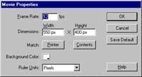 If you haven’t already done so, start Flash with a new movie. Pop open the Modify->Movie box, and define attributes for the movie you’re about to create; this includes attributes like movie width and height, background colour and frame rate.