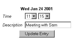 The “edit.php” script also contains some extra code, used to pre-fill the form with the details of the appointment. If you take a look at the script, you’ll see that, before the form is displayed, a query is generated to obtain the appointment time and description, and this information is then used to pre-fill the text box and pre-select the hour and minute from the drop-down lists.