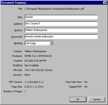 And now, when you view the dynamically-generated PDF file in Acrobat Reader, you’ll see this information in the Document Properties window.