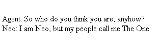 Neo: I am Neo, but my people call me The One.