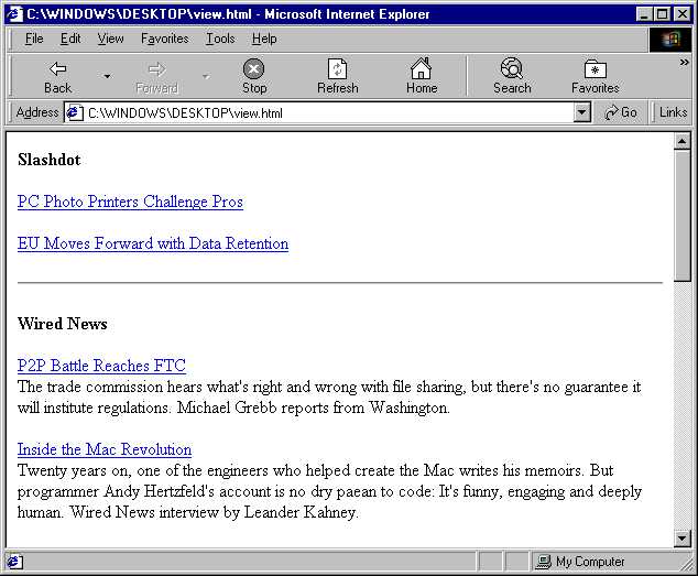 Here’s what the output might look like (note that there will a time lag in producing the page, because PHP will be silently opening HTTP connections to each URL to retrieve the corresponding RSS feed):