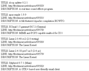 Let’s look at a simple example to put all this in perspective. Here’s the RDF file I’ll be using, culled directly from http://www.freshmeat.net/ :