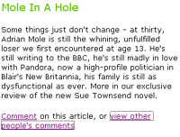 Some things just don't change - at thirty, Adrian Mole is still the whining, unfulfilled loser we first encountered at age 13. He's still writing to the BBC, he's still madly in love with Pandora, now a high-profile politician in Blair's New Britannia, his family is still as dysfunctional as ever. More in our exclusive review of the new Sue Townsend novel.