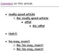 I’ve always thought that the nice thing about sites like Slashdot [http://www.slashdot.com], PHPBuilder [http://www.phpbuilder.com] and Devshed [http://www.devshed.com] is that they allow users to comment on the articles and news items posted on the site. By adding this much-needed element of interactivity (not to mention striking a blow for free speech), content-rich portals build a sense of community among users, offer an immediate and public forum for user feedback…and also provide a fair amount of entertainment in the eccentric and unpredictable postings that sometimes appear.