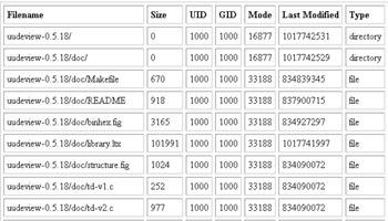 Once a file has been selected and the form submitted, the second half of the script comes into play. This code first examines the $_FILES array to check if the uploaded file is of the correct type and - if it is - instantiates an object of the Archive_Tar class to read it. The Archive_Tar object’s listContents() method is then used to obtain a list of the files within the archive, and display this information in a neatly-formatted HTML table. The columns in the table correspond to the keys of the array returned by listContents() - file name, size, ownership and permissions, and a flag indicating whether the item is a file or directory.