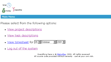 Since I’m asleep on my feet, I think I’ll skip the data entry and report generation code for the moment - this is bound to be complex, and I need all my wits about me to tackle them. Instead, I think I’ll handle the last item on the menu next - the “logout.php” script.