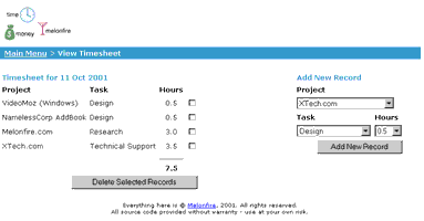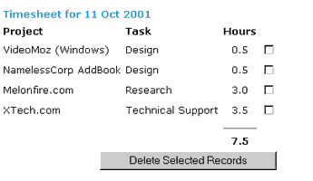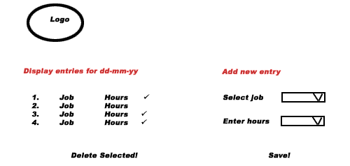 Essentially, I plan to split the page into two main sections. The left side of the page will contain a list of entries retrieved from the database, with a checkbox next to each; the user can select an entry for deletion by checking the corresponding box. The right side of the page will hold a form, which can be used to add new entries to the timesheet. Entries added from the form on the right side will immediately appear in the list on the left side.