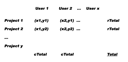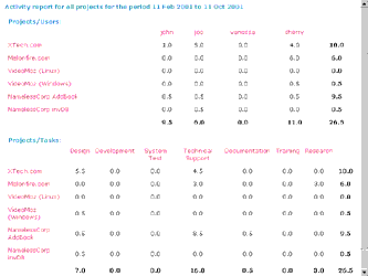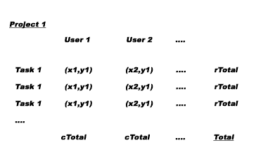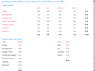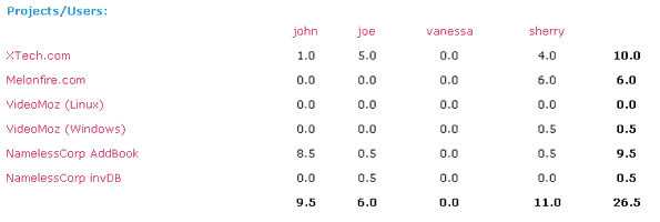 Once this report has been generated, I’d also like to print two summary reports, one listing the total hours worked by each user on the project, and the other listing the total time spent on each task within the project. These summary reports are essentially the row and column totals, which I’m displaying again to make the data easier to analyze - both the Boss and I concur that these summaries will probably be the most valuable bits of the report, as they provide a bird’s-eye view of resource allocation across tasks and users in a project.