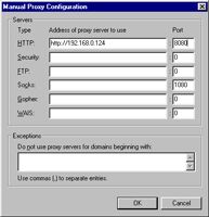 Next, you need to tell clients on the network about the proxy server. In most cases, this involves popping open the client’s configuration and setting the host name or IP address of the machine running the proxy server. Assuming that the proxy server is running on the machine identified by the IP address 192.168.0.10, here’s what the configuration looks like in Internet Explorer,