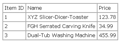 <wddxPacket version='1.0'><header/><data><array length='3'><struct><var name='name'><string>XYZ Slicer-Dicer-Toaster</string></var><var name='price'><number>123.78</number></var><var name='id'><number>1</number></var></struct><struct><var name='name'><string>FGH Serrated Carving Knife</string></var><var name='price'><number>34.99</number></var><var name='id'><number>2</number></var></struct><struct><var name='name'><string>Dual-Tub Washing Machine</string></var><var name='price'><number>455.99</number></var><var name='id'><number>3</number></var></struct></array></data></wddxPacket>