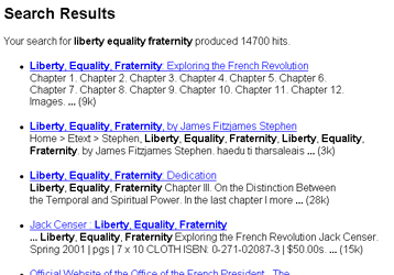Once the user enters a search term and submits the form, the second half of the script springs into action, initializes the SOAP client and performs the query on the Google SOAP server. The result is then formatted and displayed as in the previous example. Here’s an example of what it might look like: