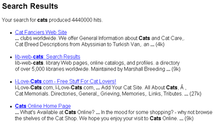 Most of this is identical to what you saw in the previous example, except that, this time, instead of just dumping the result array to the screen, I’ve used a “foreach” loop to iterate through it and display the matches as items in a bulleted list. Note how the various keys of the SOAP response array can be used to build the list of matching Web pages, with descriptions and URLs.