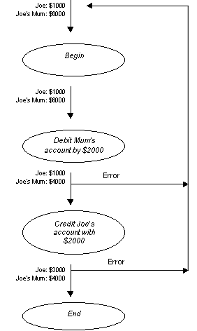 A failure in any of the steps above - say, for example, if the bank debited Joe’s Mum’s account but wasn’t able to credit the same amount to Joe’s account - would imply the failure of the entire transaction. In the event of such a failure, the transaction would be cancelled, and the system (in this example, the bank balances of Joe and his mother) would be returned to its earlier, pre-transaction state.