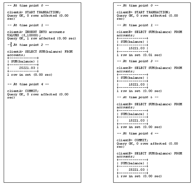 As you can see in this example, even though client A’s transaction has completed, client B cannot see the changes made by that transaction until its own transaction is complete. There is thus a high isolation level between transactions in this example, which ensures that clients do not read incorrect data.